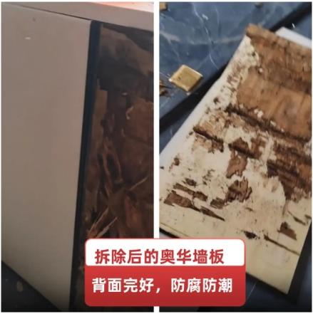 在奧華貴溪老店重裝現(xiàn)場(chǎng),施工人員對(duì)原有靠窗墻體進(jìn)行拆除時(shí),木工板的地方已經(jīng)完全腐爛,但是相鄰的奧華墻板卻沒有任何變化,背部仍然非常光滑,進(jìn)一步證實(shí)奧華墻板真正做到了防霉,防潮等效果,也讓經(jīng)銷商對(duì)奧華產(chǎn)品,奧華品牌更加有信心。